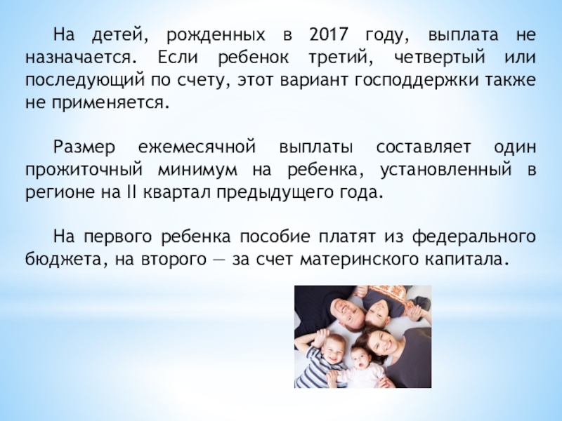 Слайд 12 На детей, рожденных в 2017 году, выплата не назначается. Если