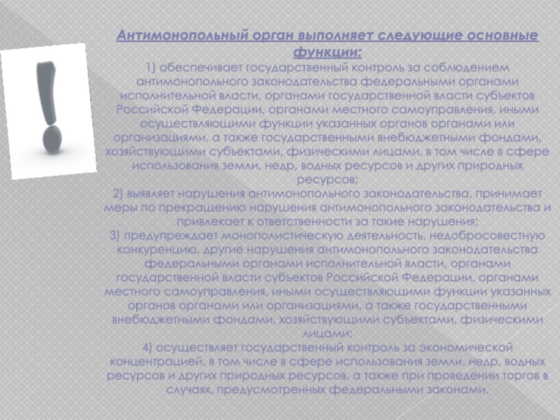 Слайд 2Антимонопольный орган выполняет следующие основные функции: