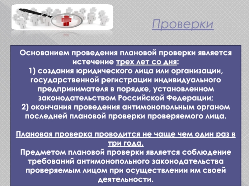 Предметом плановой проверки является соблюдение требований антимонопольного законодательства проверяемым лицом при осуществлении им своей деятельности.