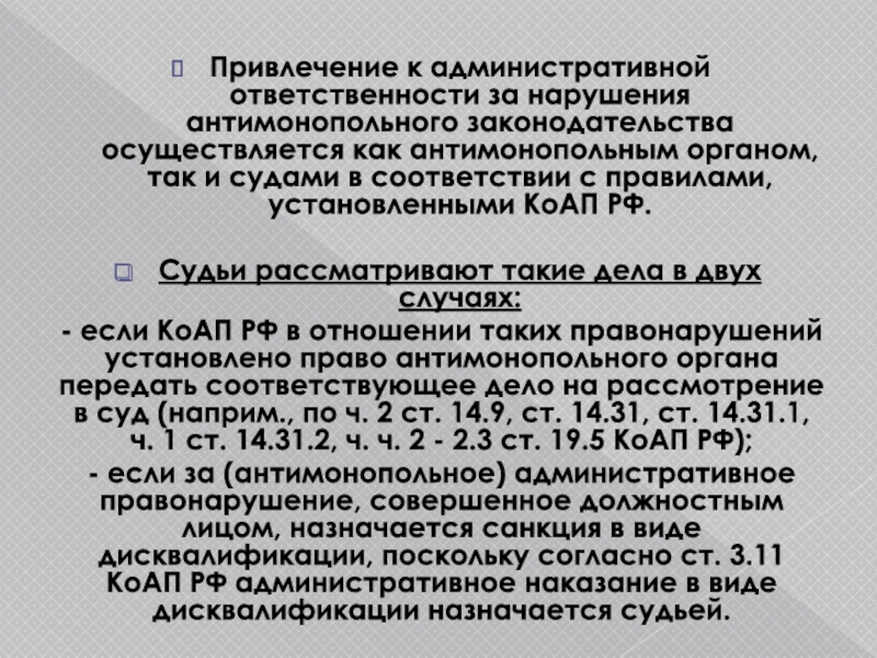Слайд 24Привлечение к административной ответственности за нарушения антимонопольного законодательства осуществляется как
