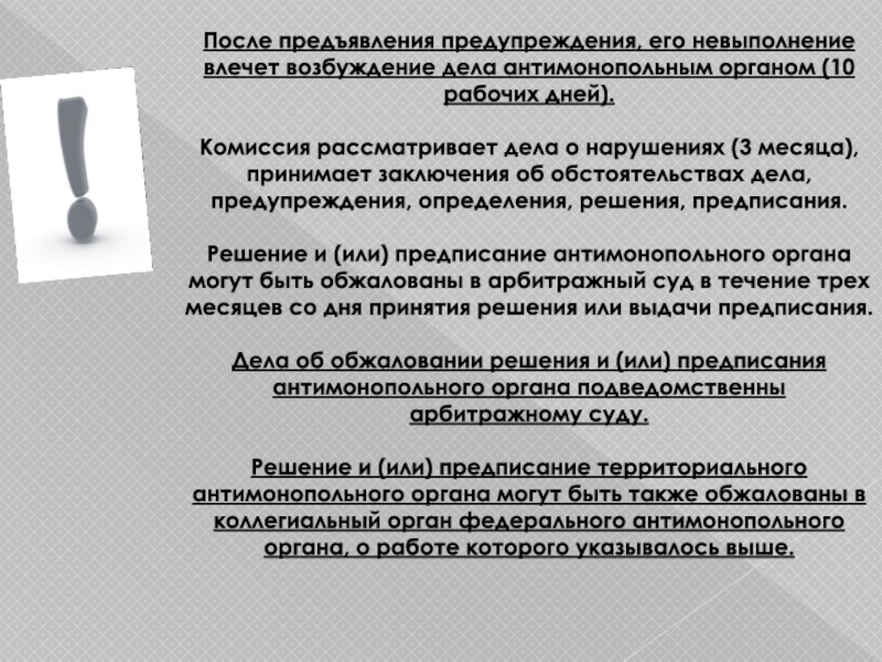 После предъявления предупреждения, его невыполнение влечет возбуждение дела антимонопольным органом