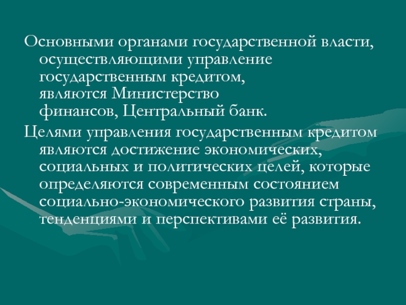 Слайд 4Основными органами государственной власти, осуществляющими управление государственным кредитом, являются Министерство финансов, Центральный