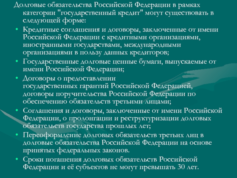Слайд 6Долговые обязательства Российской Федерации в рамках категории "государственный кредит" могут