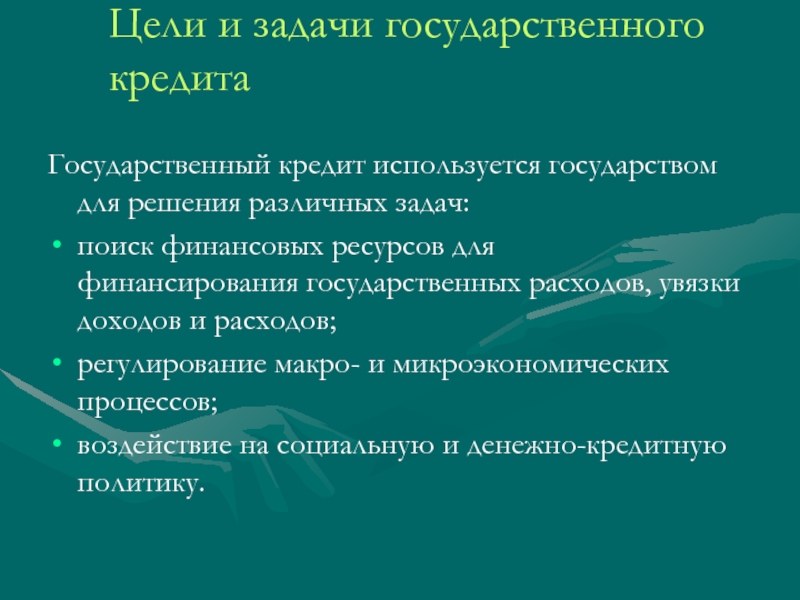 Цели и задачи государственного кредита Государственный кредит используется государством для решения различных задач:поиск финансовых ресурсов для финансирования государственных расходов, увязки доходов и расходов;регулирование макро- и микроэкономических процессов;воздействие на социальную и денежно-кредитную политику.