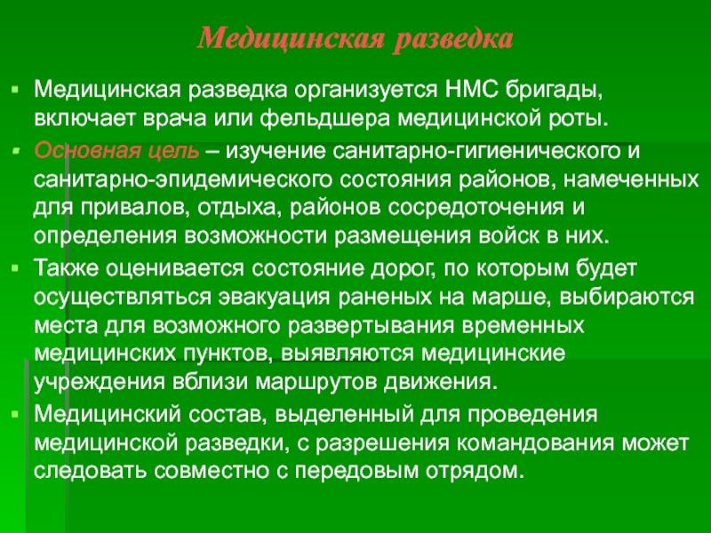 Слайд 19Медицинская разведка организуется по возможности заблаговременно медицинской службой части. Основные