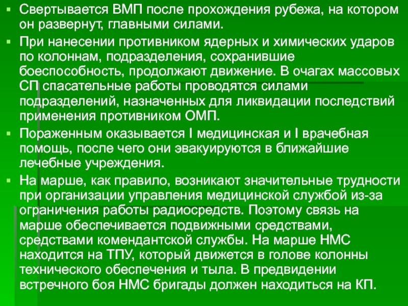 Слайд 14Свертывается ВМП после прохождения рубежа, на котором он развернут, главными