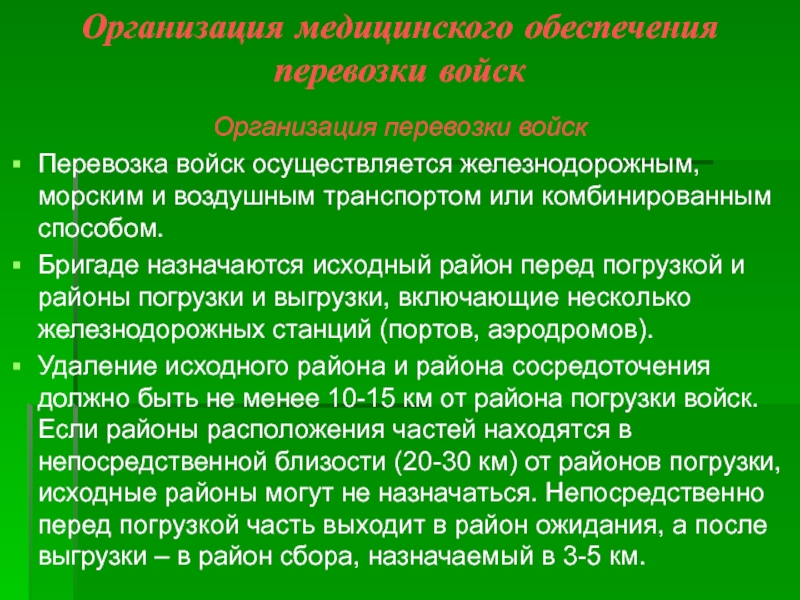 Слайд 15Организация медицинского обеспечения перевозки войск