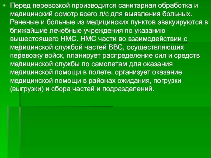 в ближайшие лечебные учреждения по указанию вышестоящего НМС. НМС части во взаимодействии с медицинской службой частей ВВС, осуществляющих перевозку войск, планирует распределение сил и средств медицинской службы по самолетам для оказания медицинской помощи в полете, организует оказание медицинской помощи в районах ожидания, погрузки (выгрузки) и сбора частей и подразделений.