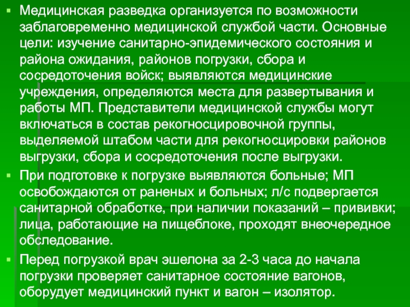 и сосредоточения войск; выявляются медицинские учреждения, определяются места для развертывания и работы МП. Представители медицинской службы могут включаться в состав рекогносцировочной группы, выделяемой штабом части для рекогносцировки районов выгрузки, сбора и сосредоточения после выгрузки.