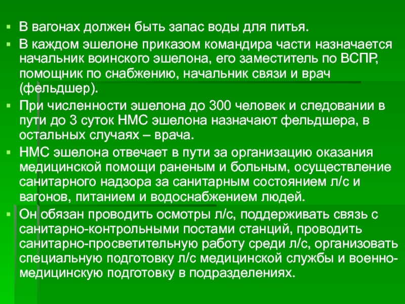 При численности эшелона до 300 человек и следовании в пути до 3 суток НМС эшелона назначают фельдшера, в остальных случаях – врача.