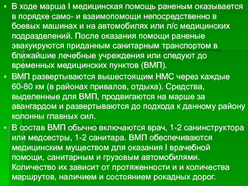 Слайд 13В ходе марша I медицинская помощь раненым оказывается в порядке