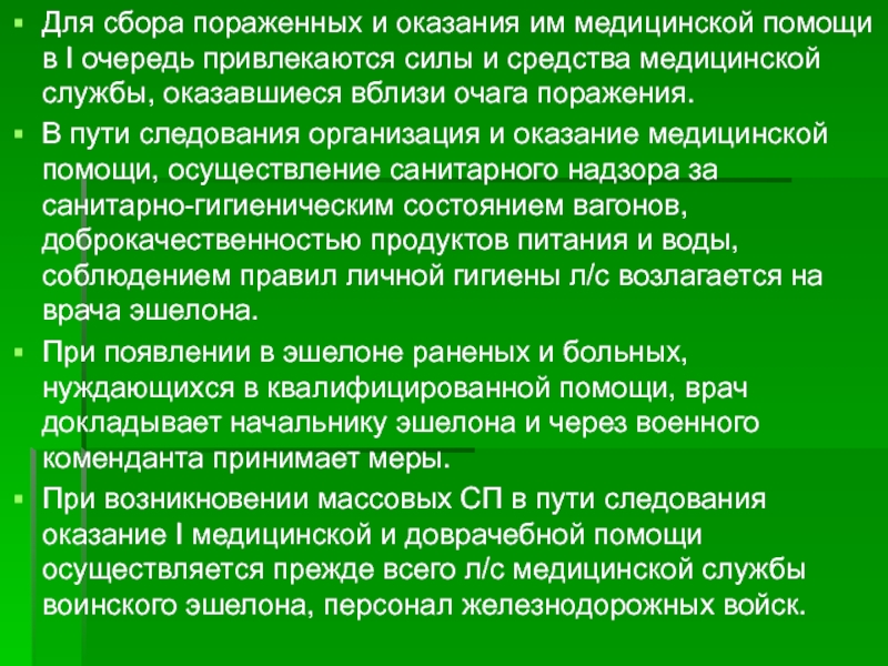 При возникновении массовых СП во время погрузки войск медицинская служба перевозимых войск обеспечивает сбор пораженных, оказание им I медицинской, доврачебной и проведение неотложных мероприятий I врачебной помощи.