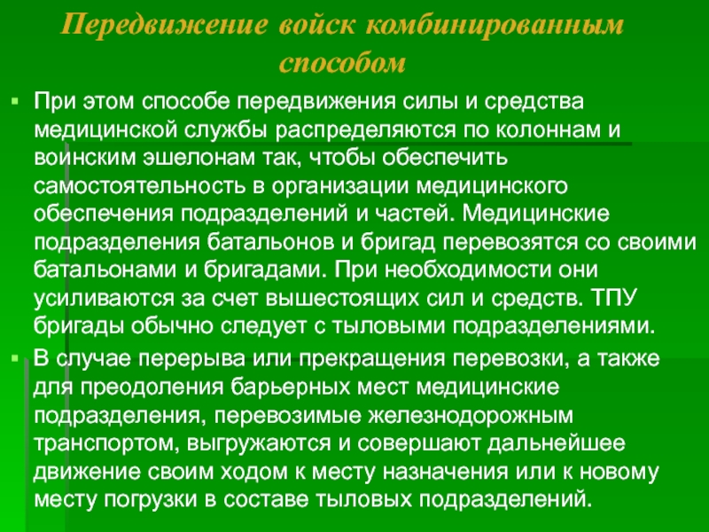 обеспечить самостоятельность в организации медицинского обеспечения подразделений и частей. Медицинские подразделения батальонов и бригад перевозятся со своими батальонами и бригадами. При необходимости они усиливаются за счет вышестоящих сил и средств. ТПУ бригады обычно следует с тыловыми подразделениями.