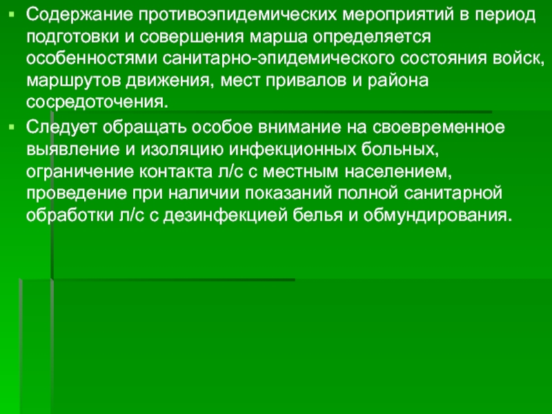 Слайд 10Содержание противоэпидемических мероприятий в период подготовки и совершения марша определяется