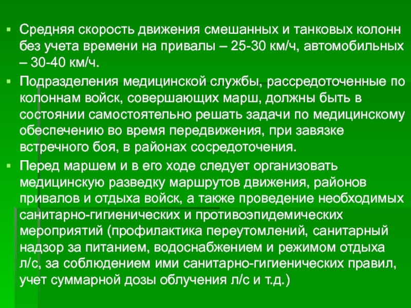 Перед маршем и в его ходе следует организовать медицинскую разведку маршрутов движения, районов привалов и отдыха войск, а также проведение необходимых санитарно-гигиенических и противоэпидемических мероприятий (профилактика переутомлений, санитарный надзор за питанием, водоснабжением и режимом отдыха л/с, за соблюдением ими санитарно-гигиенических правил, учет суммарной дозы облучения л/с и т.д.)