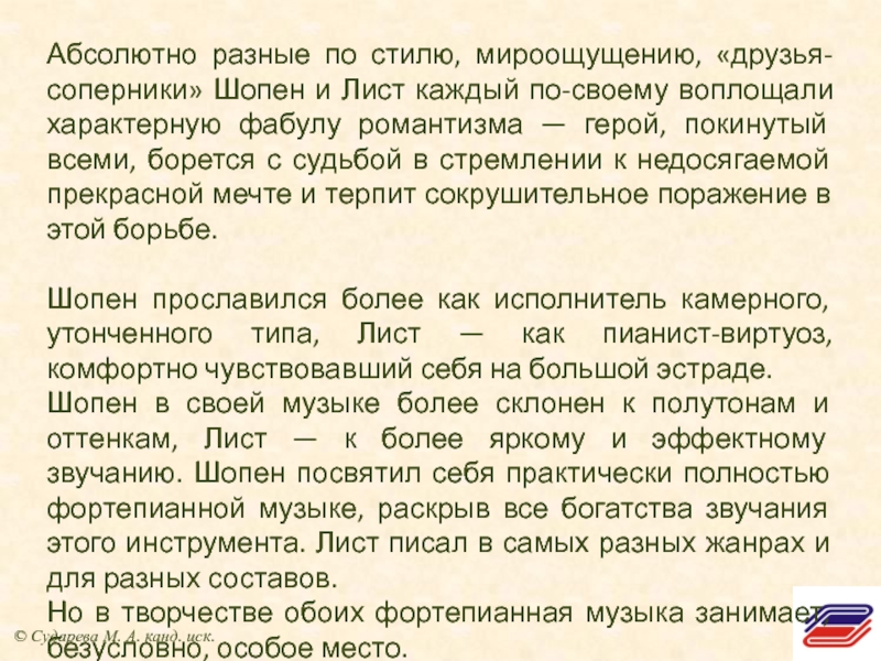 «друзья-соперники» Шопен и Лист каждый по-своему воплощали характерную фабулу романтизма