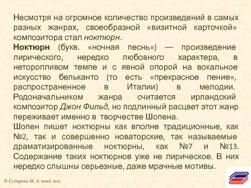(букв. «ночная песнь») –– произведение лирического, нередко любовного характера, в неторопливом темпе и с явной опорой на вокальное искусство бельканто (то есть «прекрасное пение», распространенное в Италии) в мелодии. Родоначальником жанра считается ирландский композитор Джон Фильд, но подлинный расцвет этот жанр переживает именно в творчестве Шопена.