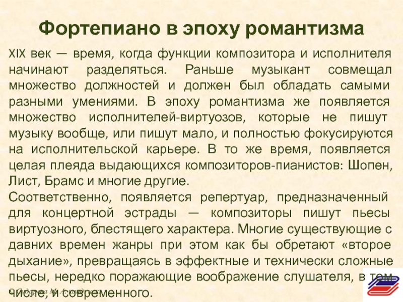 музыкант совмещал множество должностей и должен был обладать самыми разными умениями. В эпоху романтизма же появляется множество исполнителей-виртуозов, которые не пишут музыку вообще, или пишут мало, и полностью фокусируются на исполнительской карьере. В то же время, появляется целая плеяда выдающихся композиторов-пианистов: Шопен, Лист, Брамс и многие другие.