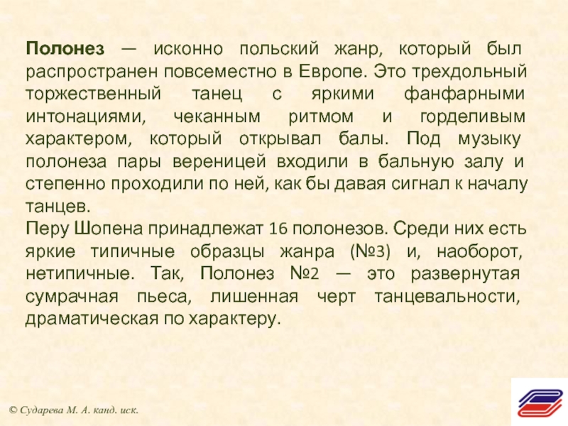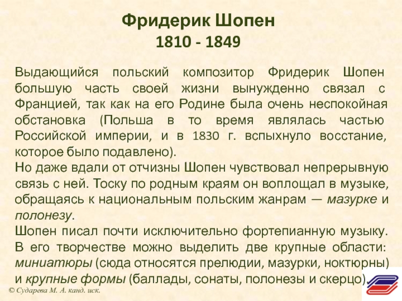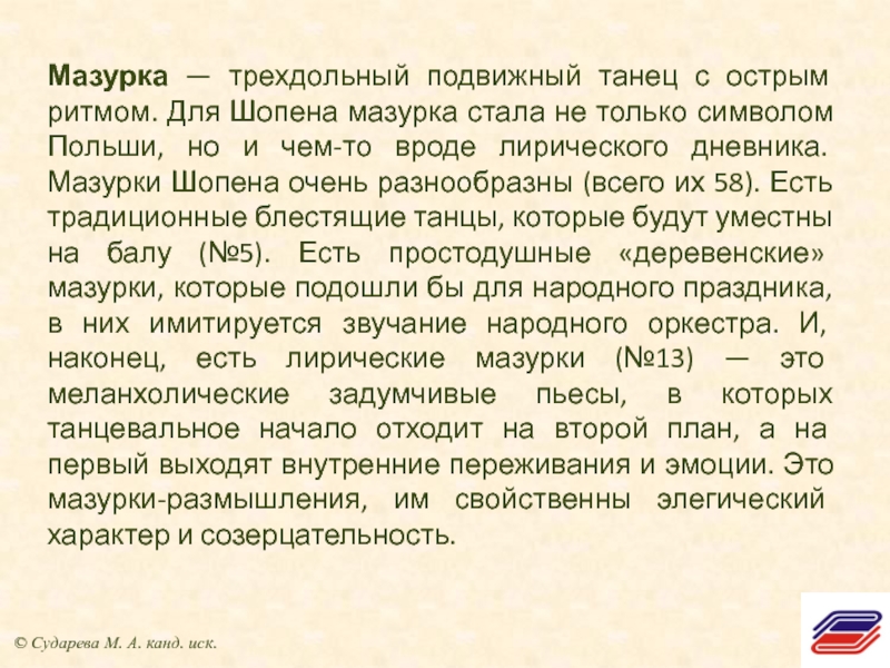с острым ритмом. Для Шопена мазурка стала не только символом