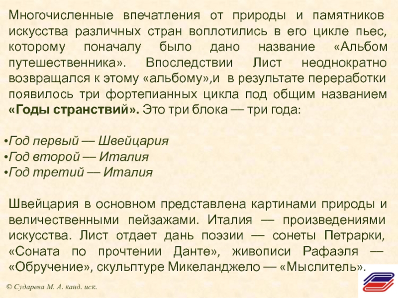 поначалу было дано название «Альбом путешественника». Впоследствии Лист неоднократно возвращался к этому «альбому»,и в результате переработки появилось три фортепианных цикла под общим названием «Годы странствий». Это три блока –– три года: