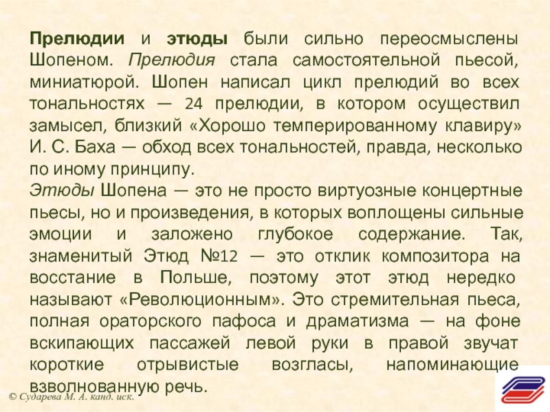 переосмыслены Шопеном. Прелюдия стала самостоятельной пьесой, миниатюрой. Шопен написал цикл