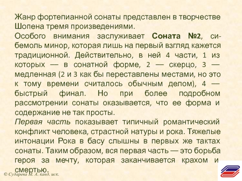 минор, которая лишь на первый взгляд кажется традиционной. Действительно, в ней 4 части, 1 из которых –– в сонатной форме, 2 –– скерцо, 3 –– медленная (2 и 3 как бы переставлены местами, но это к тому времени считалось обычным делом), 4 –– быстрый финал. Но при более подробном рассмотрении сонаты оказывается, что ее форма и содержание не так просты.