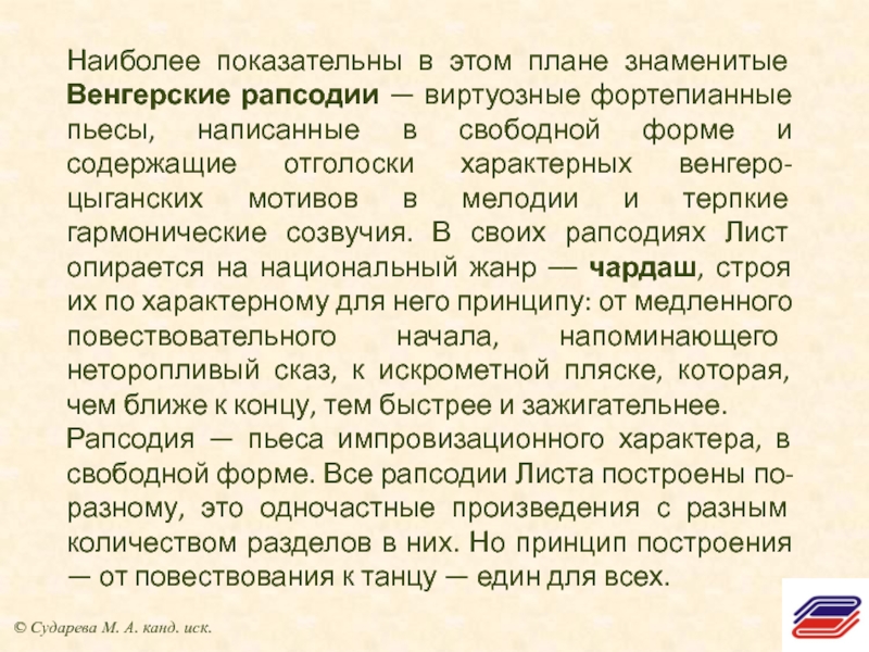 форме и содержащие отголоски характерных венгеро-цыганских мотивов в мелодии и терпкие гармонические созвучия. В своих рапсодиях Лист опирается на национальный жанр –– чардаш, строя их по характерному для него принципу: от медленного повествовательного начала, напоминающего неторопливый сказ, к искрометной пляске, которая, чем ближе к концу, тем быстрее и зажигательнее.