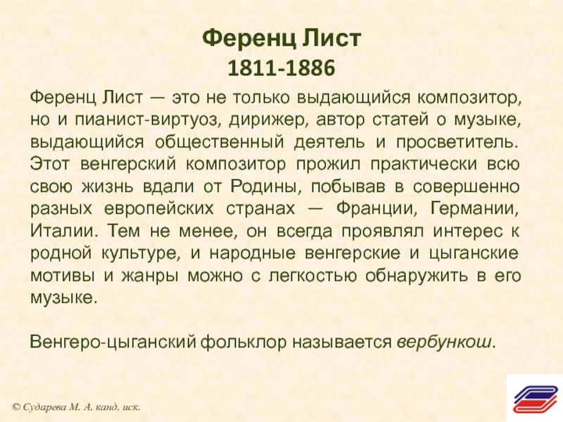 о музыке, выдающийся общественный деятель и просветитель. Этот венгерский композитор прожил практически всю свою жизнь вдали от Родины, побывав в совершенно разных европейских странах — Франции, Германии, Италии. Тем не менее, он всегда проявлял интерес к родной культуре, и народные венгерские и цыганские мотивы и жанры можно с легкостью обнаружить в его музыке.