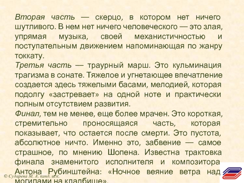 Финал, тем не менее, еще более мрачен. Это короткая, стремительно проносящаяся часть, которая показывает, что остается после смерти. Это пустота, абсолютное ничто. Именно это, забвение –– самое страшное, по мнению Шопена. Известна трактовка финала знаменитого исполнителя и композитора Антона Рубинштейна: «Ночное веяние ветра над могилами на кладбище».