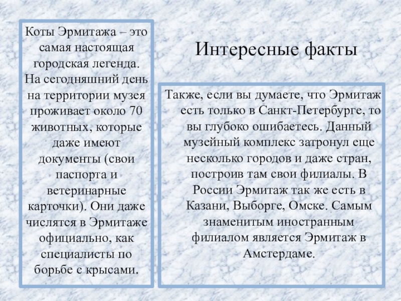 Коты Эрмитажа – это самая настоящая городская легенда. На сегодняшний день на территории музея проживает около 70 животных, которые даже имеют документы (свои паспорта и ветеринарные карточки). Они даже числятся в Эрмитаже официально, как специалисты по борьбе с крысами.