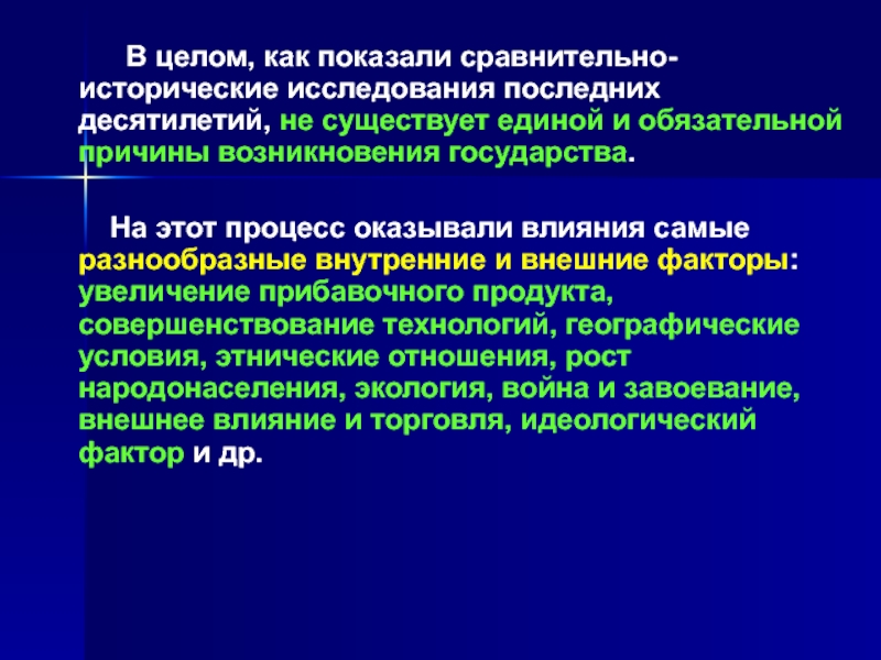 На этот процесс оказывали влияния самые разнообразные внутренние и внешние факторы: увеличение прибавочного продукта, совершенствование технологий, географические условия, этнические отношения, рост народонаселения, экология, война и завоевание, внешнее влияние и торговля, идеологический фактор и др.