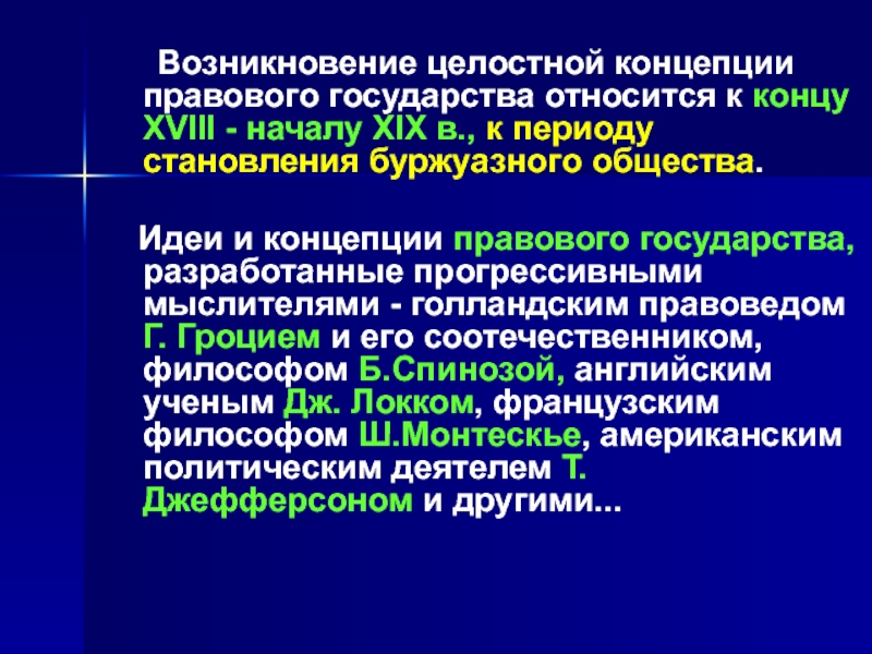 Идеи и концепции правового государства, разработанные прогрессивными мыслителями - голландским правоведом Г. Гроцием и его соотечественником, философом Б.Спинозой, английским ученым Дж. Локком, французским философом Ш.Монтескье, американским политическим деятелем Т. Джефферсоном и другими...
