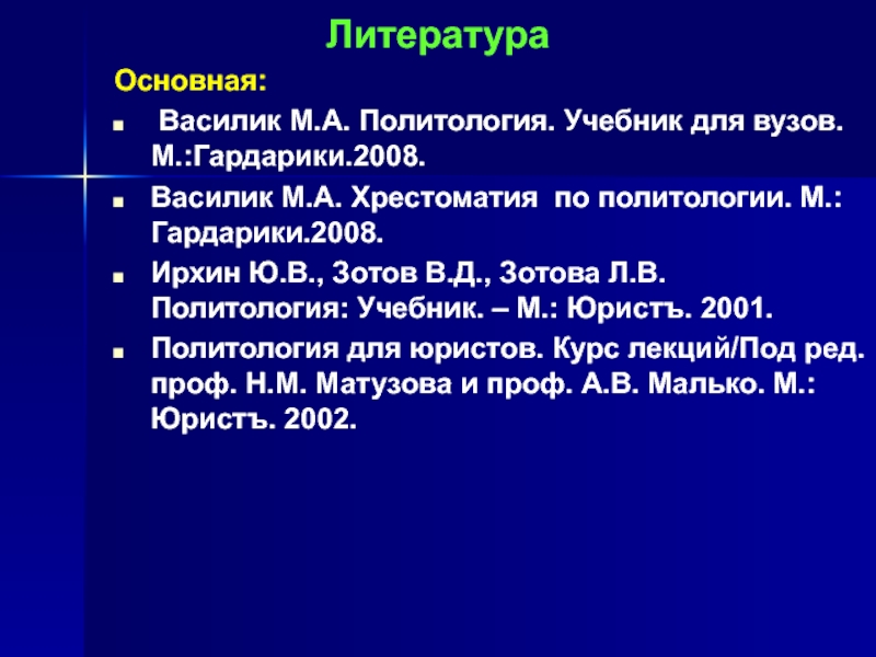 Политология для юристов. Курс лекций/Под ред. проф. Н.М. Матузова и проф. А.В. Малько. М.: Юристъ. 2002.