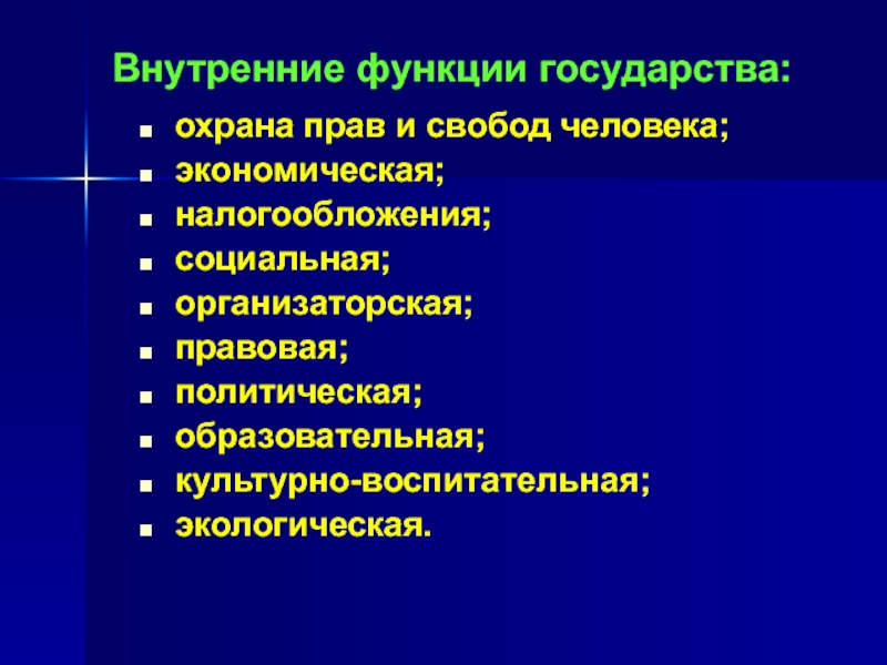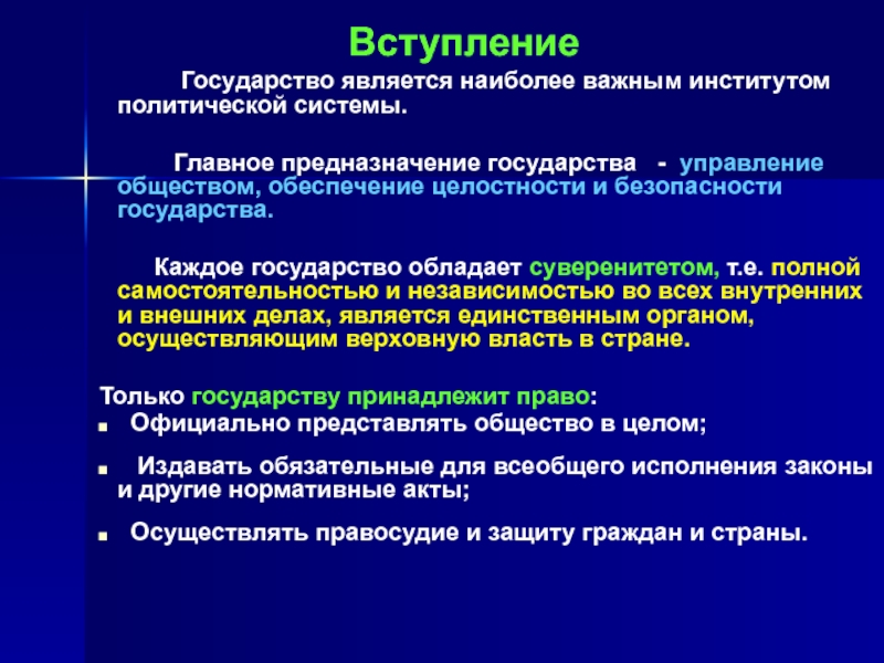 Каждое государство обладает суверенитетом, т.е. полной самостоятельностью и независимостью во всех внутренних и внешних делах, является единственным органом, осуществляющим верховную власть в стране.