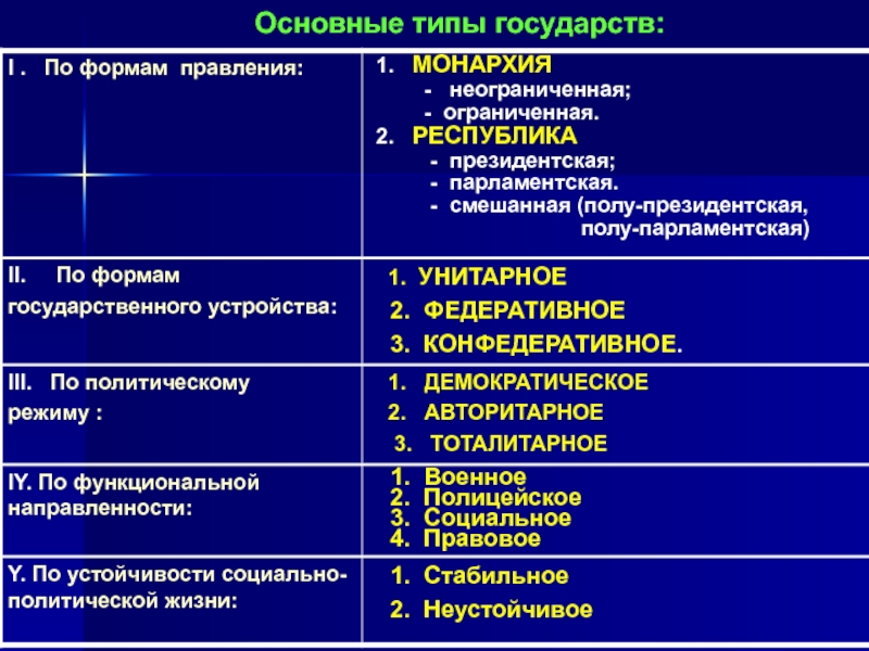 Таковы например, государства фашистской Германии, бывшего CCСP, Гаити (1960 - 1980-х гг.), современного Ирака, КНДР (Северной Кореи) и многих стран, если брать разные периоды их развития.
