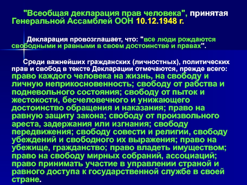 Среди важнейших гражданских (личностных), политических прав и свобод в тексте Декларации отмечаются, прежде всего: право каждого человека на жизнь, на свободу и личную неприкосновенность; свободу от рабства и подневольного состояния; свободу от пыток и жестокости, бесчеловечного и унижающего достоинство обращения и наказания; право на равную защиту закона; свободу от произвольного ареста, задержания или изгнания; свободу передвижения; свободу совести и религии, свободу убеждений и свободного их выражения; право на убежище, гражданство; право владеть имуществом; право на свободу мирных собраний, ассоциаций; право принимать участие в управлении страной и равного доступа к государственной службе в своей стране.