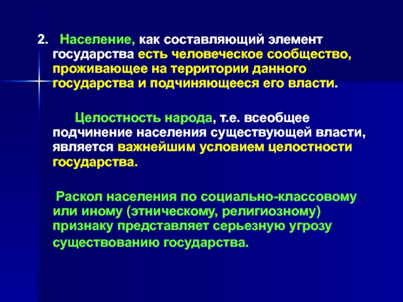 Целостность народа, т.е. всеобщее подчинение населения существующей власти, является важнейшим условием целостности государства.