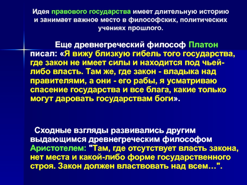 Сходные взгляды развивались другим выдающимся древнегреческим философом Аристотелем: "Там, где отсутствует власть закона, нет места и какой-либо форме государственного строя. Закон должен властвовать над всем…".