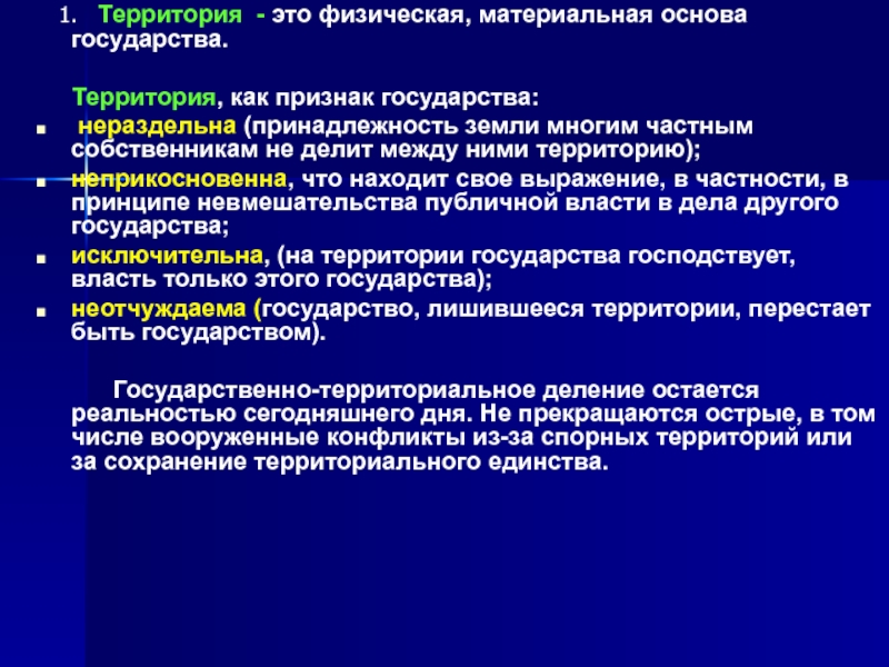 Государственно-территориальное деление остается реальностью сегодняшнего дня. Не прекращаются острые, в том числе вооруженные конфликты из-за спорных территорий или за сохранение территориального единства.