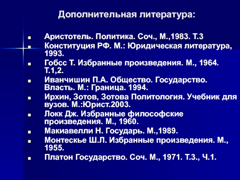 Политология. Курс лекций/Под ред. проф. М.Н. Марченко.М.: МГУ 2001.