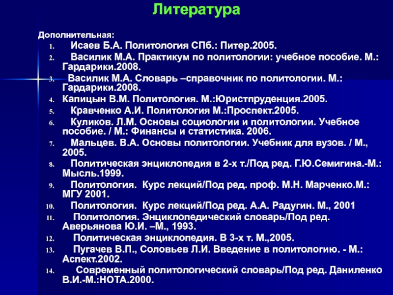 Капицын В.М. Политология. М.:Юристпруденция.2005.