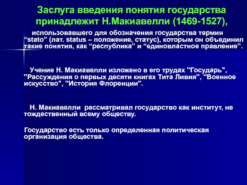 использовавшего для обозначения государства термин “stato” (лат. status –