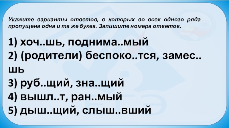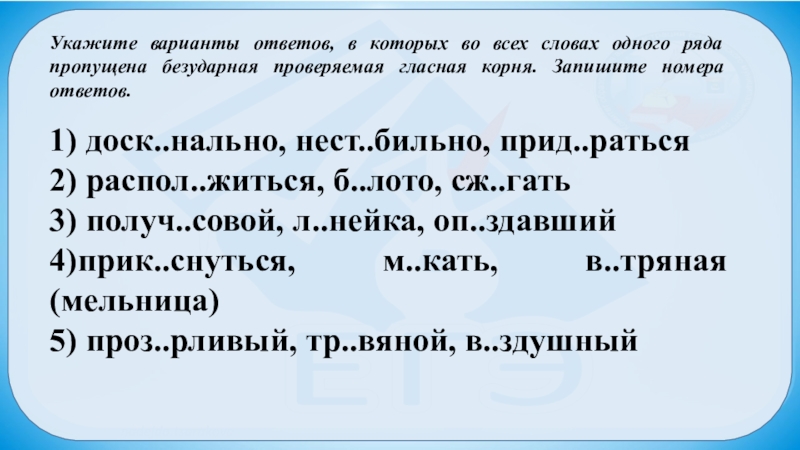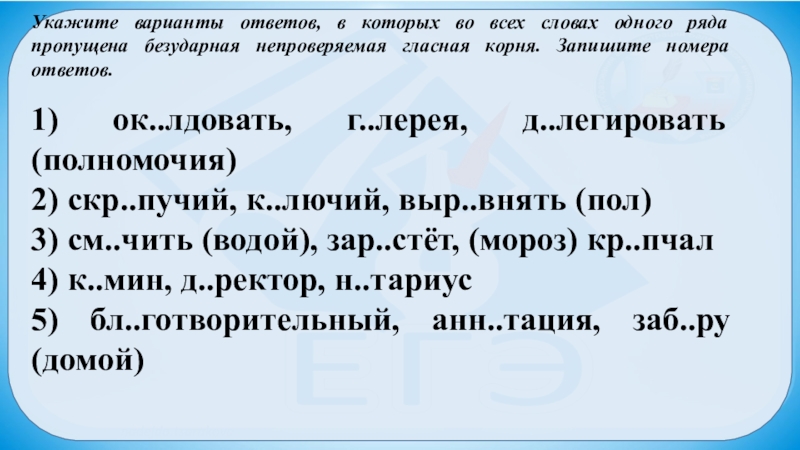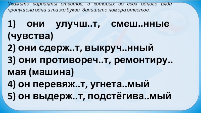 Слайд 10Укажите варианты ответов, в которых во всех одного ряда пропущена