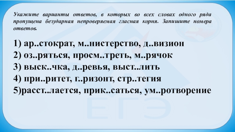 Слайд 2Укажите варианты ответов, в которых во всех словах одного ряда