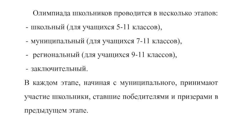 Слайд 3Олимпиада школьников проводится в несколько этапов: