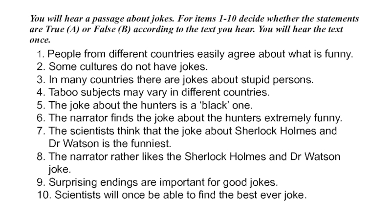 Слайд 7You will hear a passage about jokes. For items 1-10