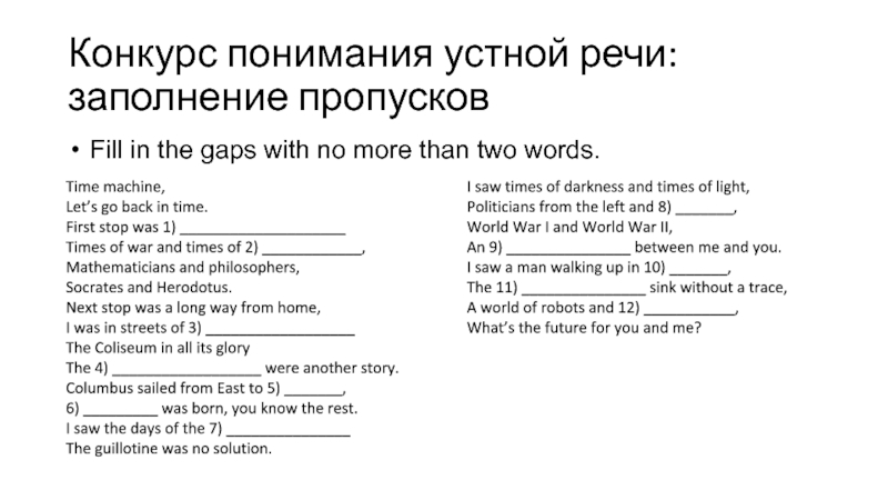 Слайд 9Конкурс понимания устной речи: заполнение пропусков