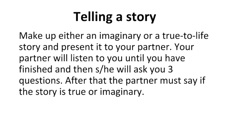 listen to you until you have finished and then s/he will ask you 3 questions. After that the partner must say if the story is true or imaginary.