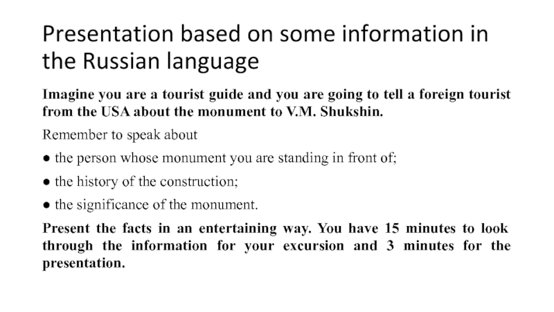 Present the facts in an entertaining way. You have 15 minutes to look through the information for your excursion and 3 minutes for the presentation.