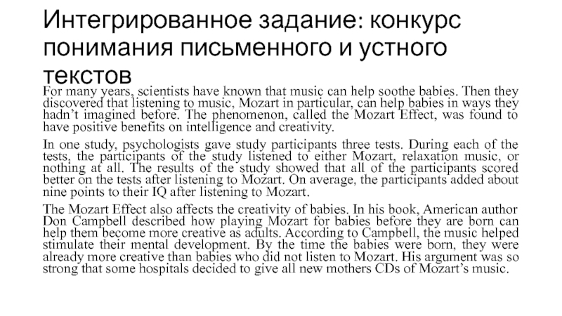 Слайд 11Интегрированное задание: конкурс понимания письменного и устного текстов